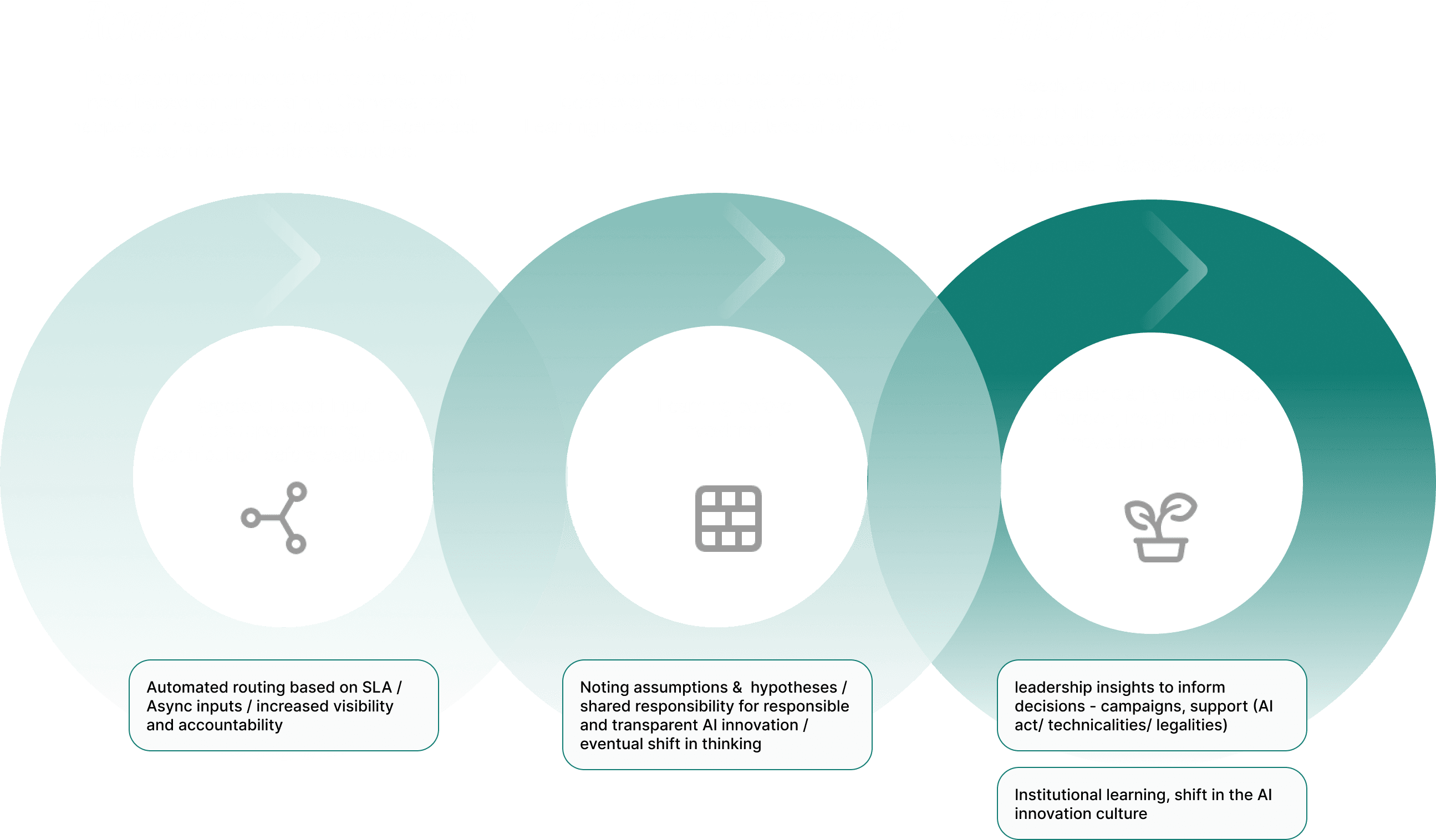 A guided entry flow surfaces assumptions and uncertainties early. A shared living canvas makes thinking visible to the right people simultaneously. An intelligent routing system directs conversations to legal, data, and technical experts in a prioritised sequence, constraints discovered before commitment,